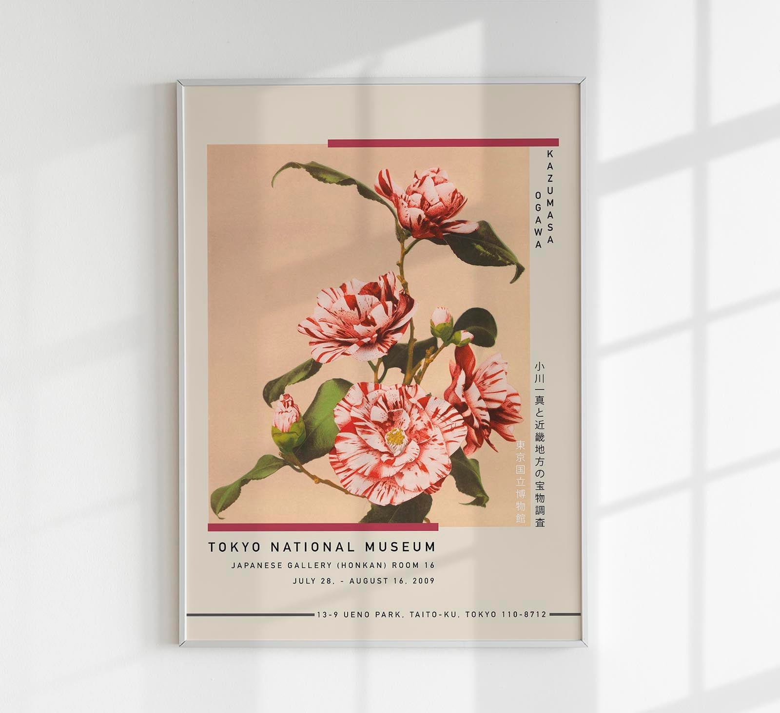 Striped Camellias by Kazumasa Exhibition Poster All posters and art prints are printed in-house on archival heavyweight matte paper, on wide format Canon professional series fine art pigment-based printers.Oversized and custom sized order requests are always welcome, however additional processing and shippings times are typically required. --- wholesale_readyBedroom, Bedroom decor, Bedroom_Decor, camellias, Cherry blossom, Exhibition Poster, flower, Home decor, Japanese Art, Japanese Poster, Japanese Print, Japanese Woodblock, Kazumasa Ogawa, new, Ogawa, pink, spring, Tokyo National Museum, Ukiyo-e, Ukiyoe Modern, Vintage Poster, Wall Art, woodblock, Woodcut Printjpn10290