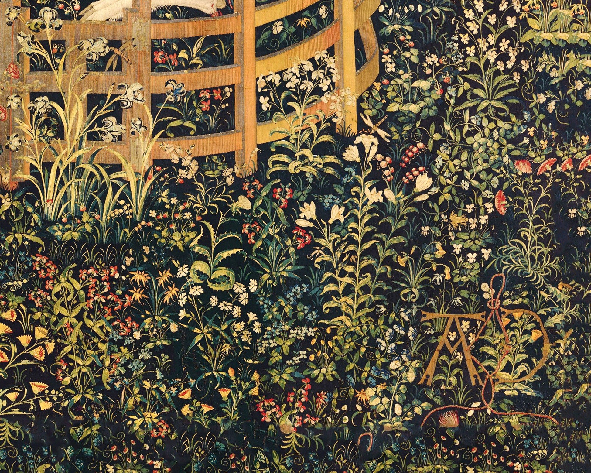 Estampado de unicornio medieval | Tapices de unicornio | Unicornio en cautiverio | Bosque floral antiguo | Arte mural de fantasía | Arte de tapices