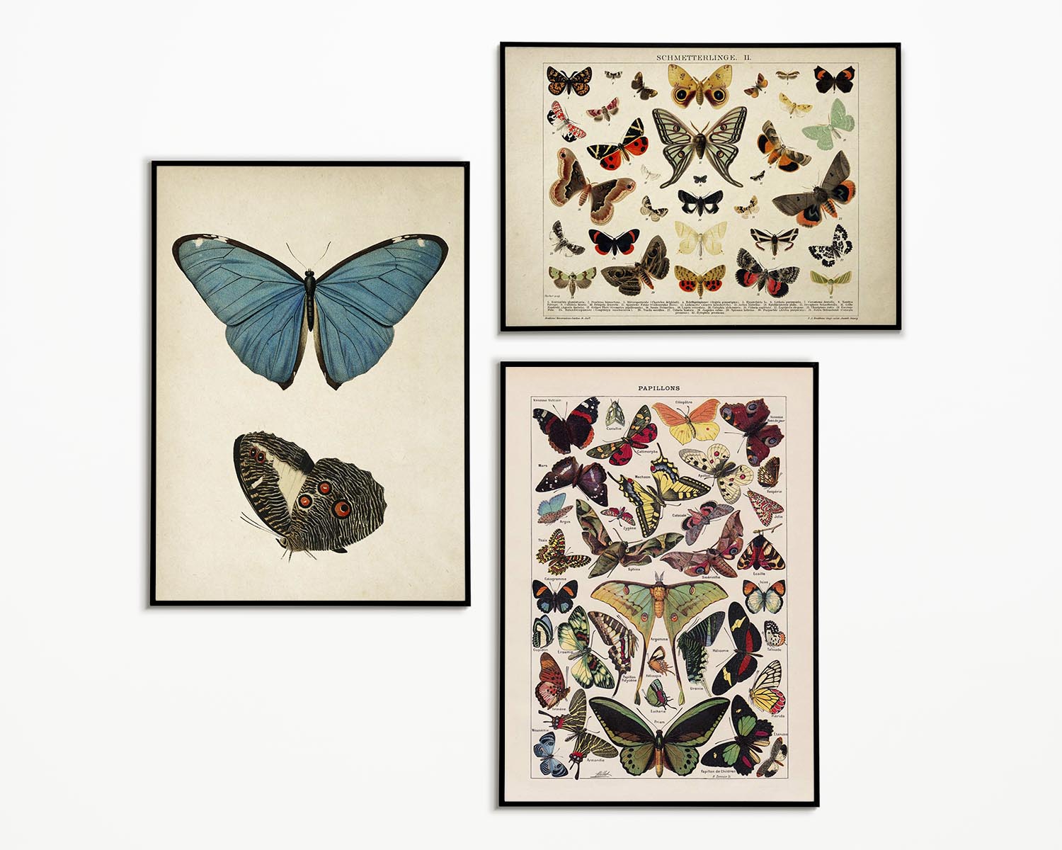 Una serie de 3 impresiones vintage de insectos mariposa disponibles con descuento.