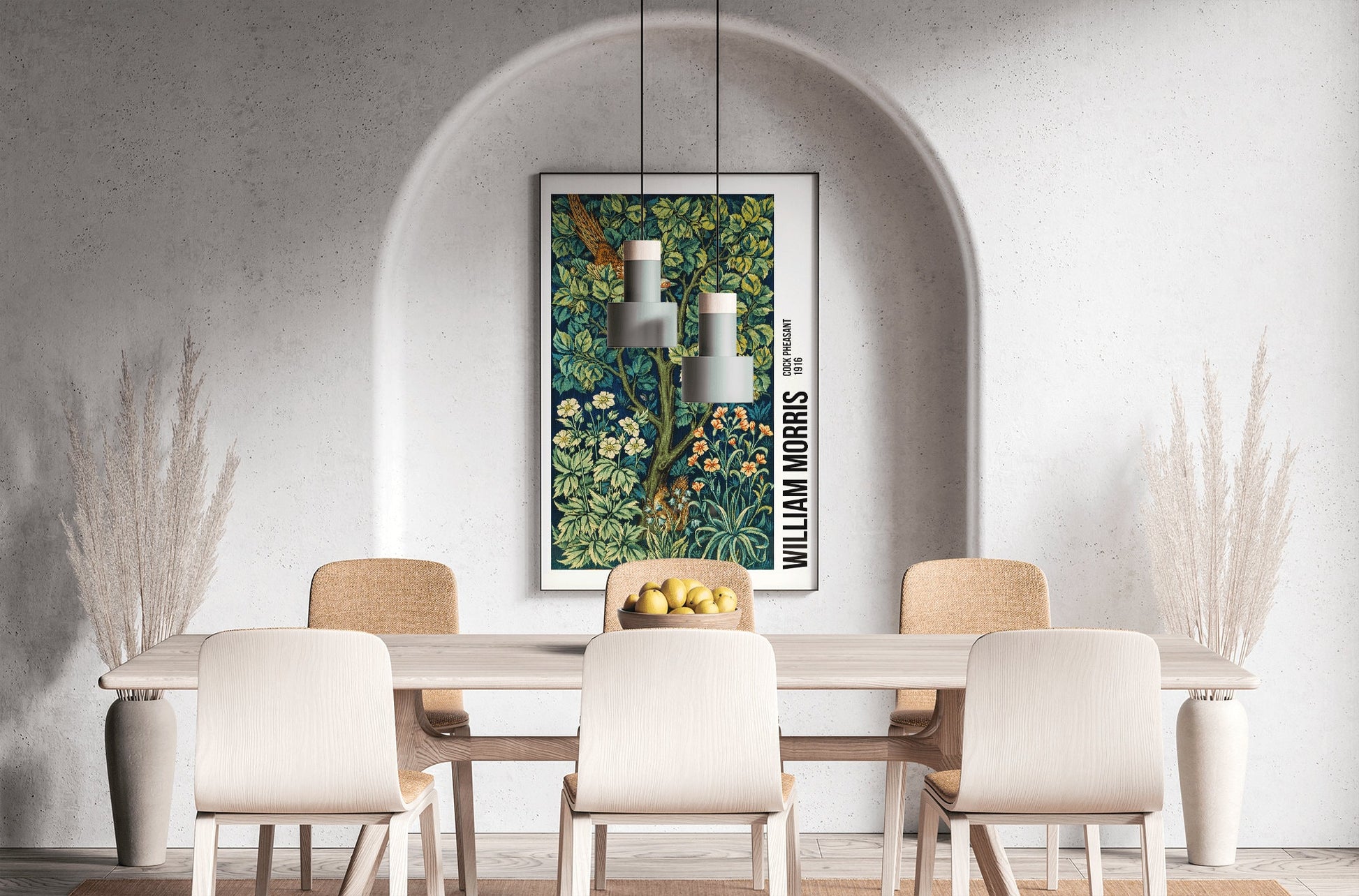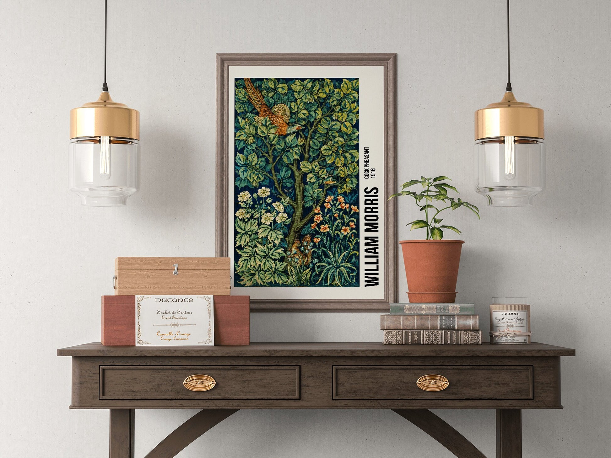 William Morris Cock Pheasant Exhibition Poster, William Morris Print, Art Nouveau, Cock Pheasant, Fabric Textured Background, Home Decor
