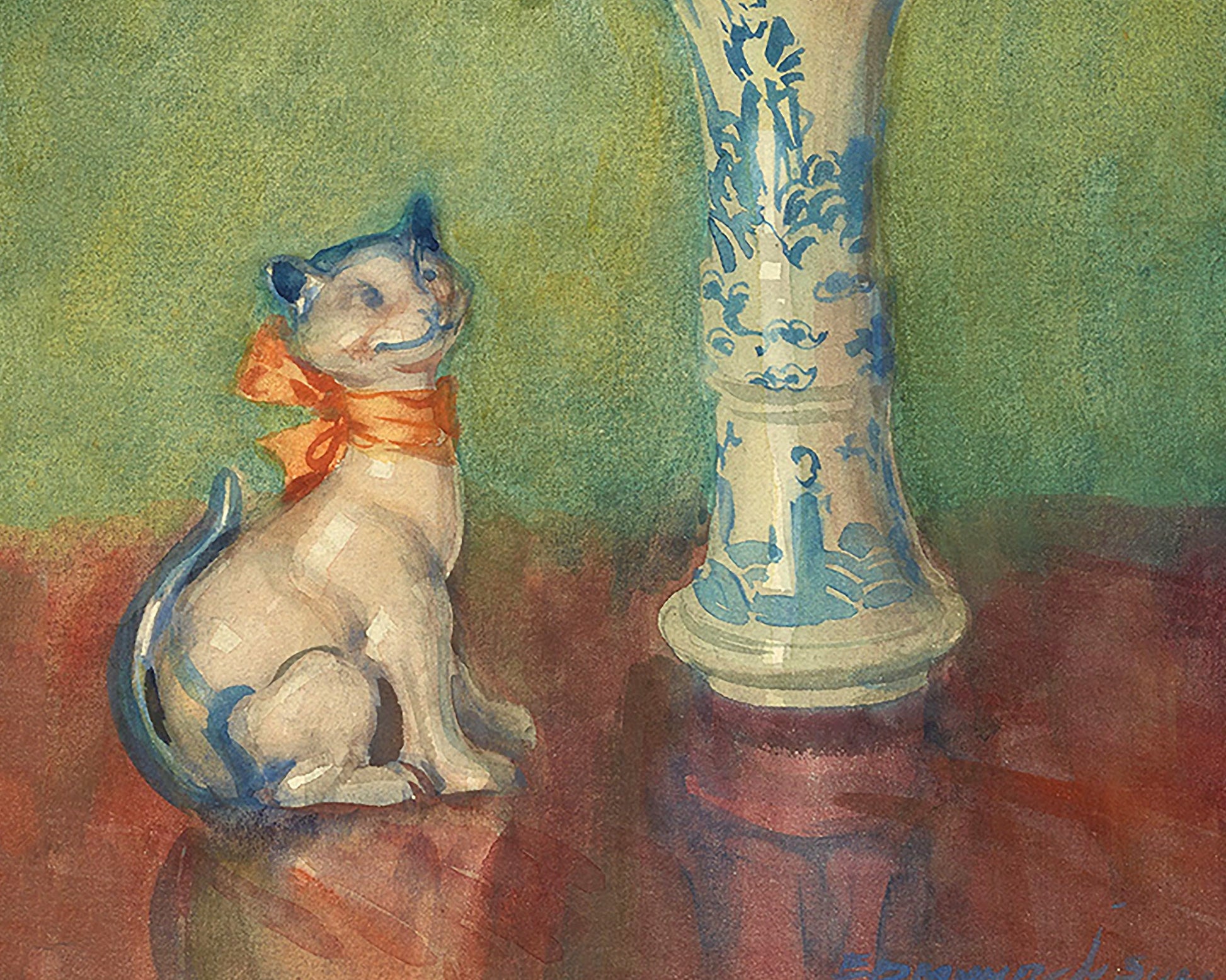 French still life | Lares et Penates | Marigolds & Staffordshire dog | Flowers with cat, dog | Animal wall art | Art nouveau print
