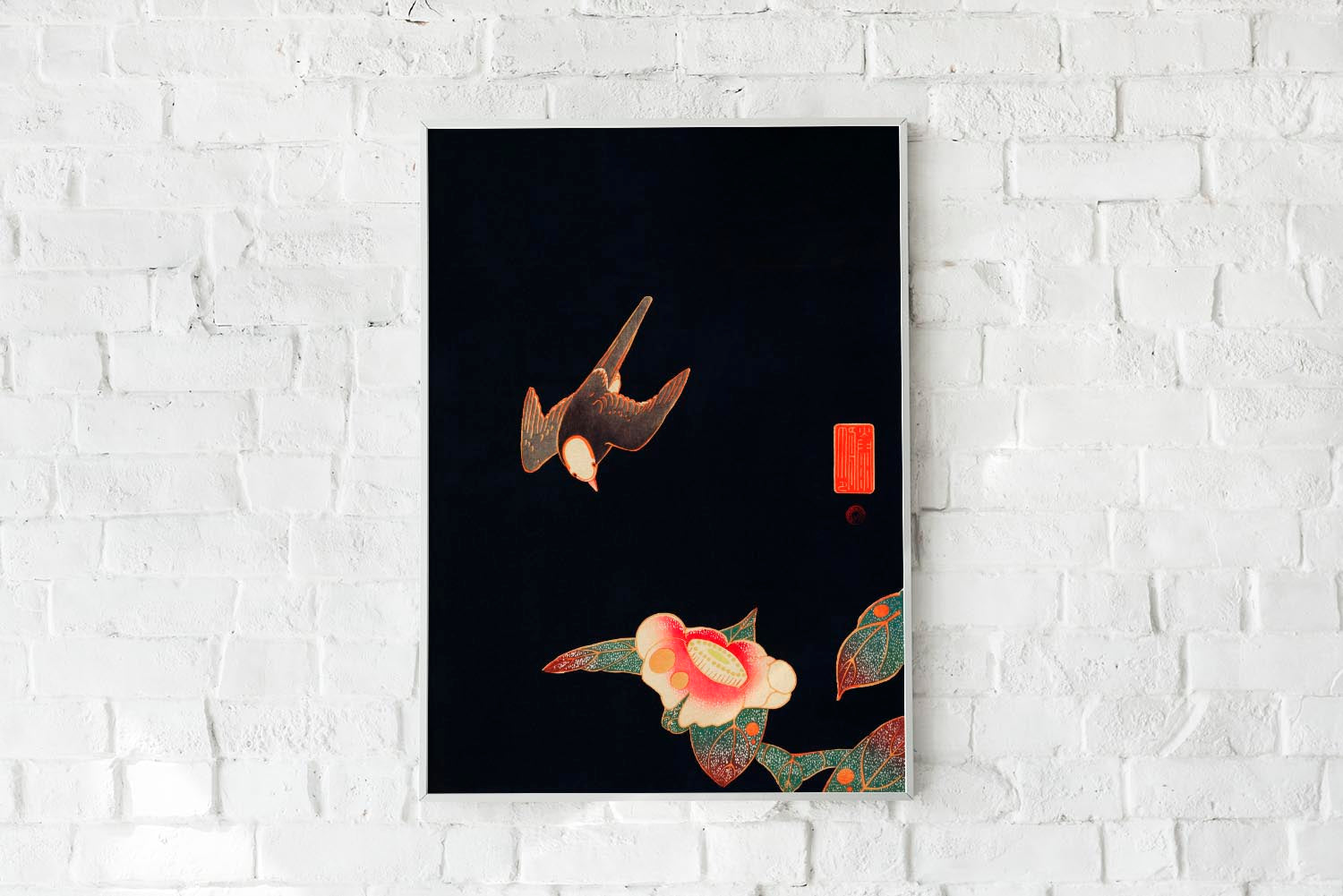 Golondrina y camelia de Ito Jakuchu Todos los carteles e impresiones artísticas se imprimen internamente en papel mate de gran gramaje de archivo, en impresoras de bellas artes de formato ancho de la serie profesional Canon basadas en pigmentos. Las solicitudes de pedidos de gran tamaño y de tamaño personalizado siempre son bienvenidas, sin embargo, generalmente se requieren tiempos de procesamiento y envío adicionales. --- wholesale_readyArte asiático, pájaro, negro, pollo, hogar, decoración del hogar, arte japonés, póster japonés, impresión japonesa, xilografía japonesa, decoración de la sala de estar, nuevo, naranja, rojo, póster vintage, arte de pared, xilografía, impresión en xilografíajpn10293