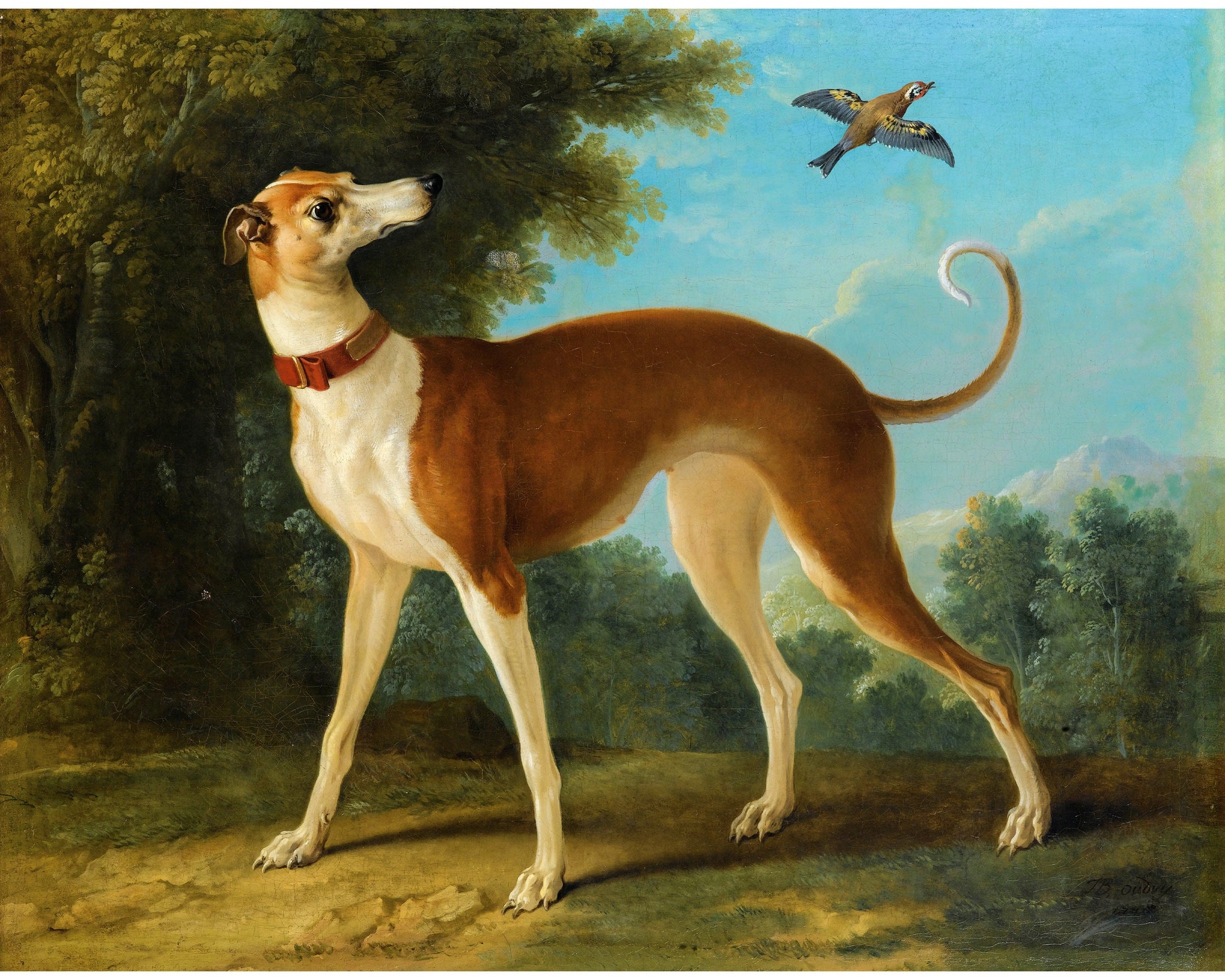 Retrato de perro antiguo | Galgo en un paisaje | Arte mural canino en la naturaleza | Arte animal antiguo | Artista francés | Jean-Baptiste Oudry