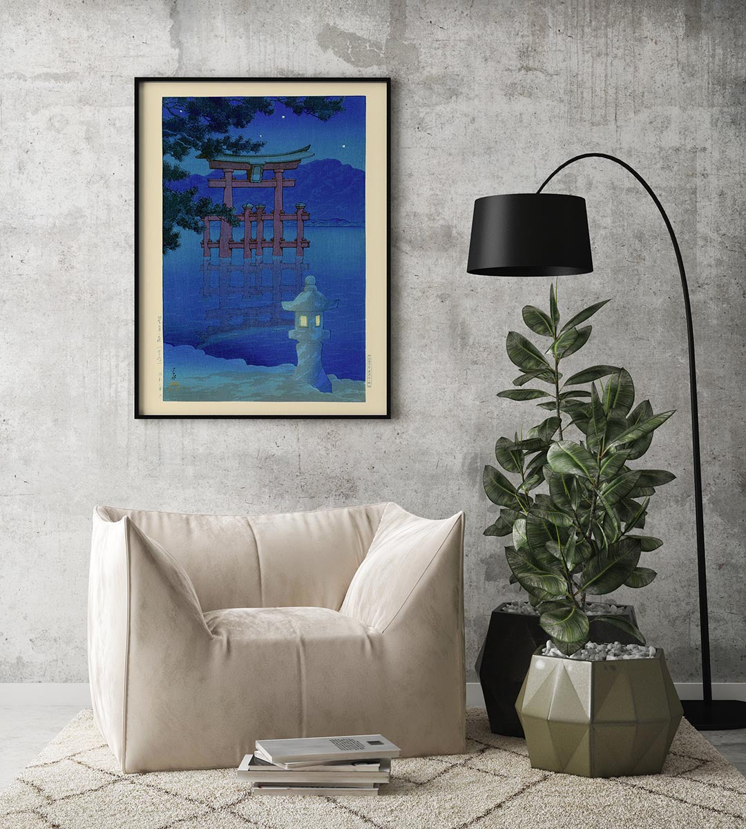 Noche estrellada en Miyajima de Hasui Todos los carteles y las impresiones artísticas se imprimen internamente en papel mate de gran gramaje de archivo, en impresoras de bellas artes de formato ancho de la serie profesional de Canon basadas en pigmentos. Las solicitudes de pedidos de gran tamaño y de tamaño personalizado siempre son bienvenidas, sin embargo, normalmente se requieren tiempos de procesamiento y envío adicionales. --- wholesale_readyArte asiático, azul, Hasui, Hasui Kawase, decoración del hogar, arte japonés, póster japonés, impresión japonesa, xilografía japonesa, paisaje, sala de estar, arte de la sala de estar, decoración de la sala de estar, nuevo, shin-hanga, templo, Ukiyo-e, Ukiyoe moderno, póster vintage, arte de pared, xilografía, impresión en xilografíajpn10289