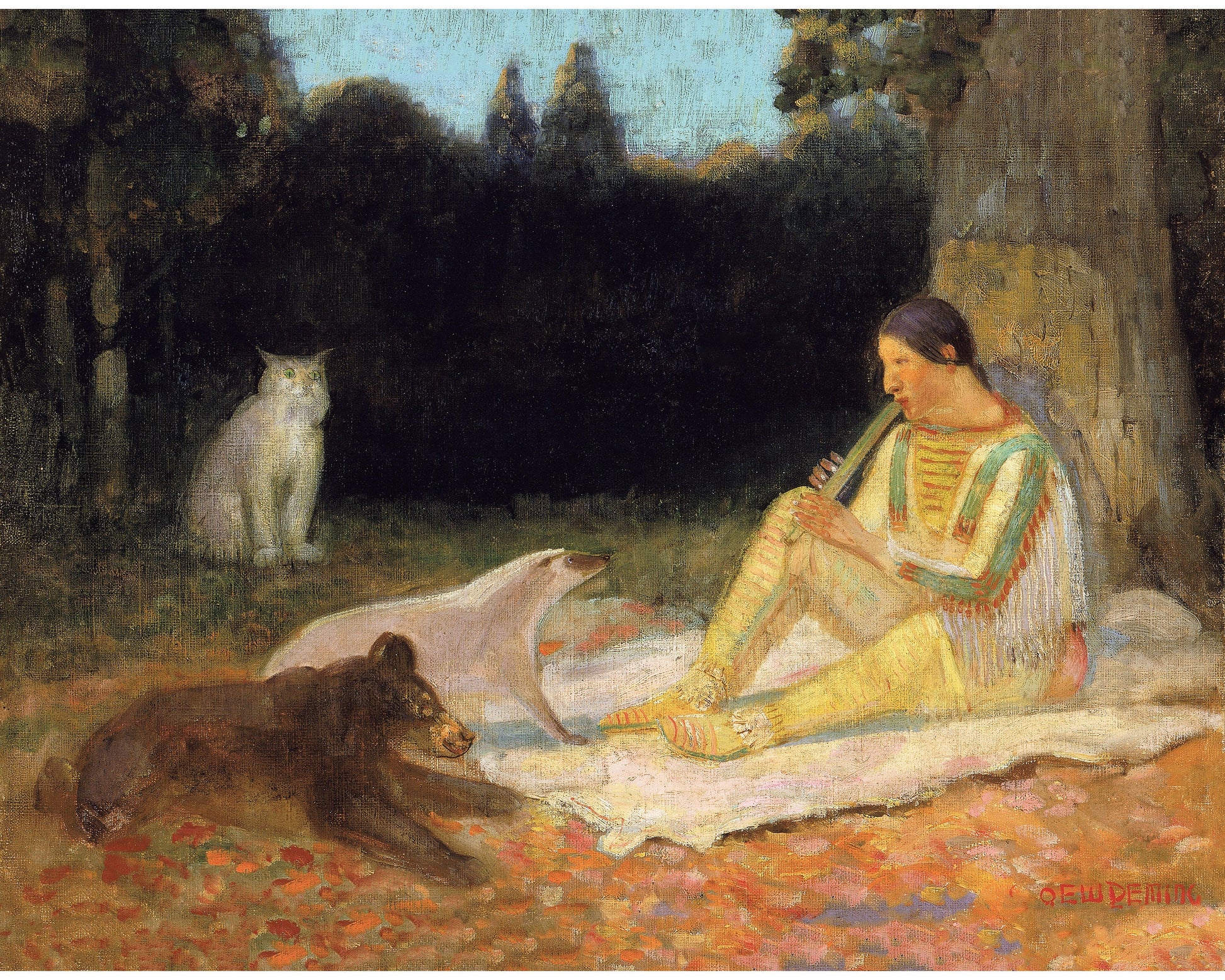 Man playing music to animals painting | The flute player | Winnebago Indians | Native American folklore print | Indigenous peoples wall art
